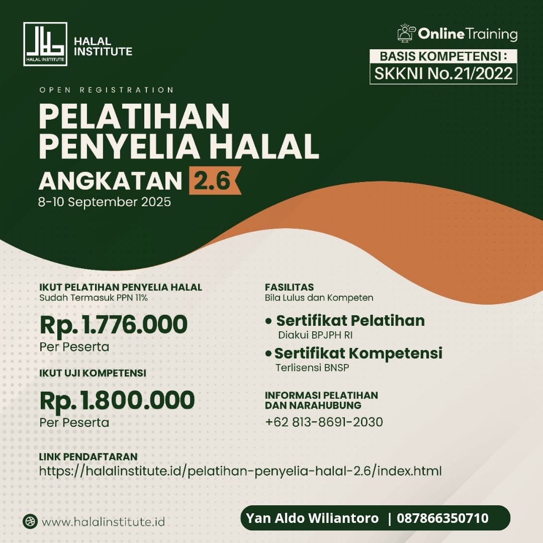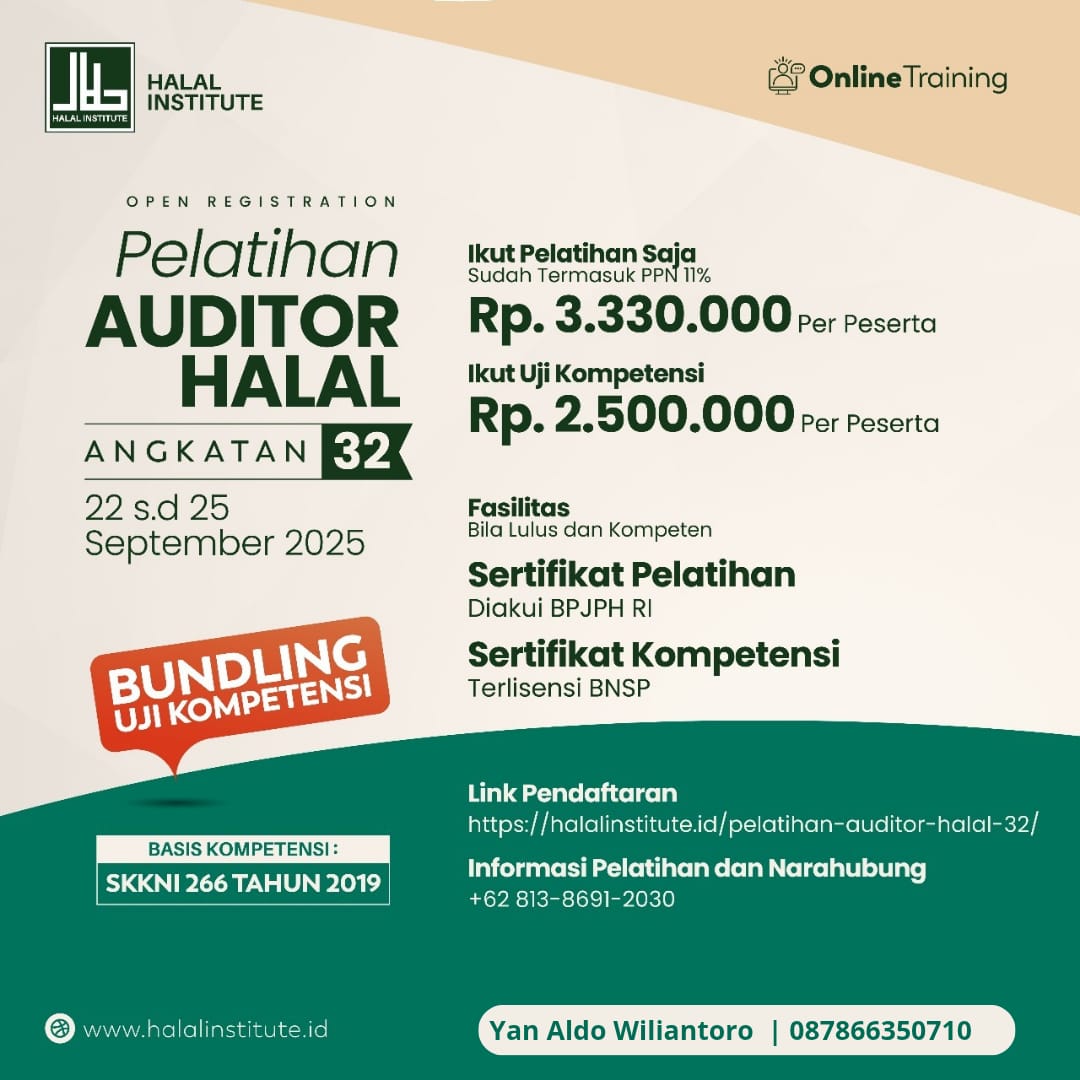 Meningkatnya jumlah permintaan sertifikasi halal produk seiring dengan dengan peningkatan kebutuhan auditor halal dalam melakukan proses audit halal. Keberhasilan proses sertifikasi halal perlu didukung oleh sumber daya yang kompeten, salah satunya auditor halal. Bagaimana seorang auditor dapat melakukan proses audit halal sesuai dengan persyaratan dan standar halal yang berlaku dan bagaimana menjadi seorang auditor halal… Selengkapnya »Pelatihan Auditor Halal Berbasis SKKNI #32